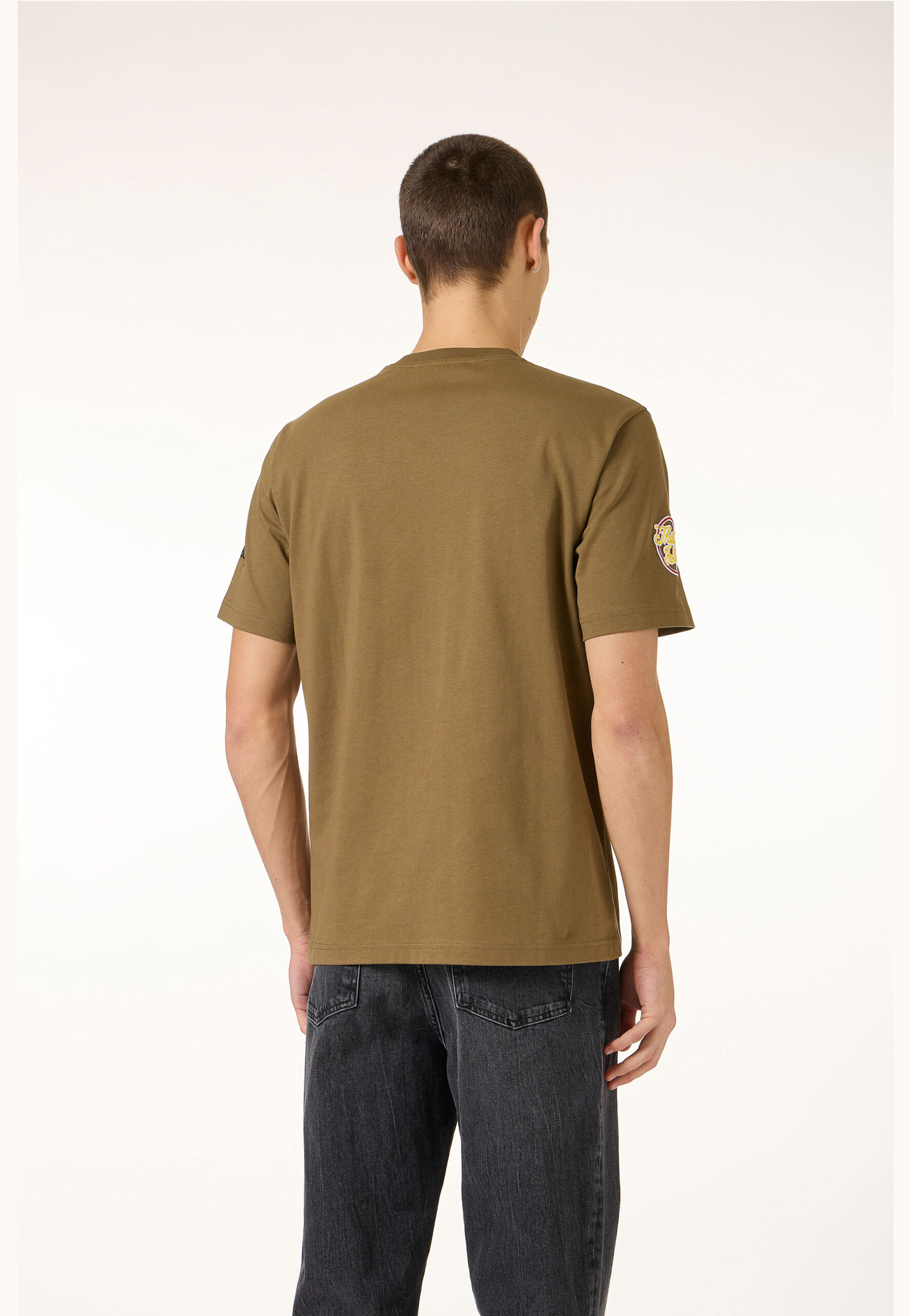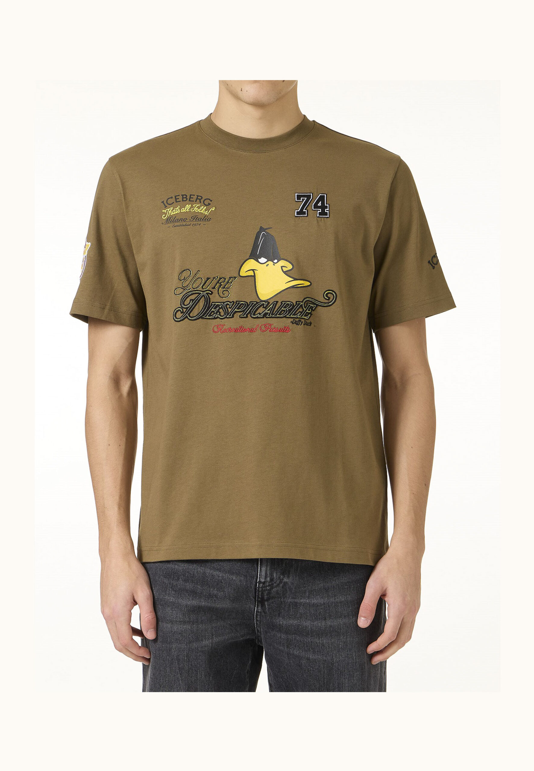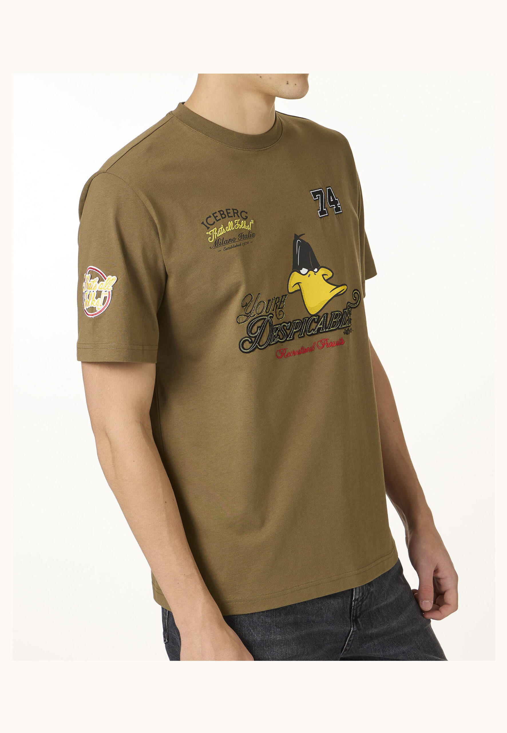 T-shirt kaki in jersey di cotone, dalla vestibilità regular che assicura comfort e libertà di movimento. Sul davanti e sulle maniche, un mix di ricami e stampe cartoon con disegno Looney Tunes introduce un accento grafico deciso e riconoscibile. Un capo dal carattere giocoso e contemporaneo, pensato per valorizzare il casual quotidiano con personalità.